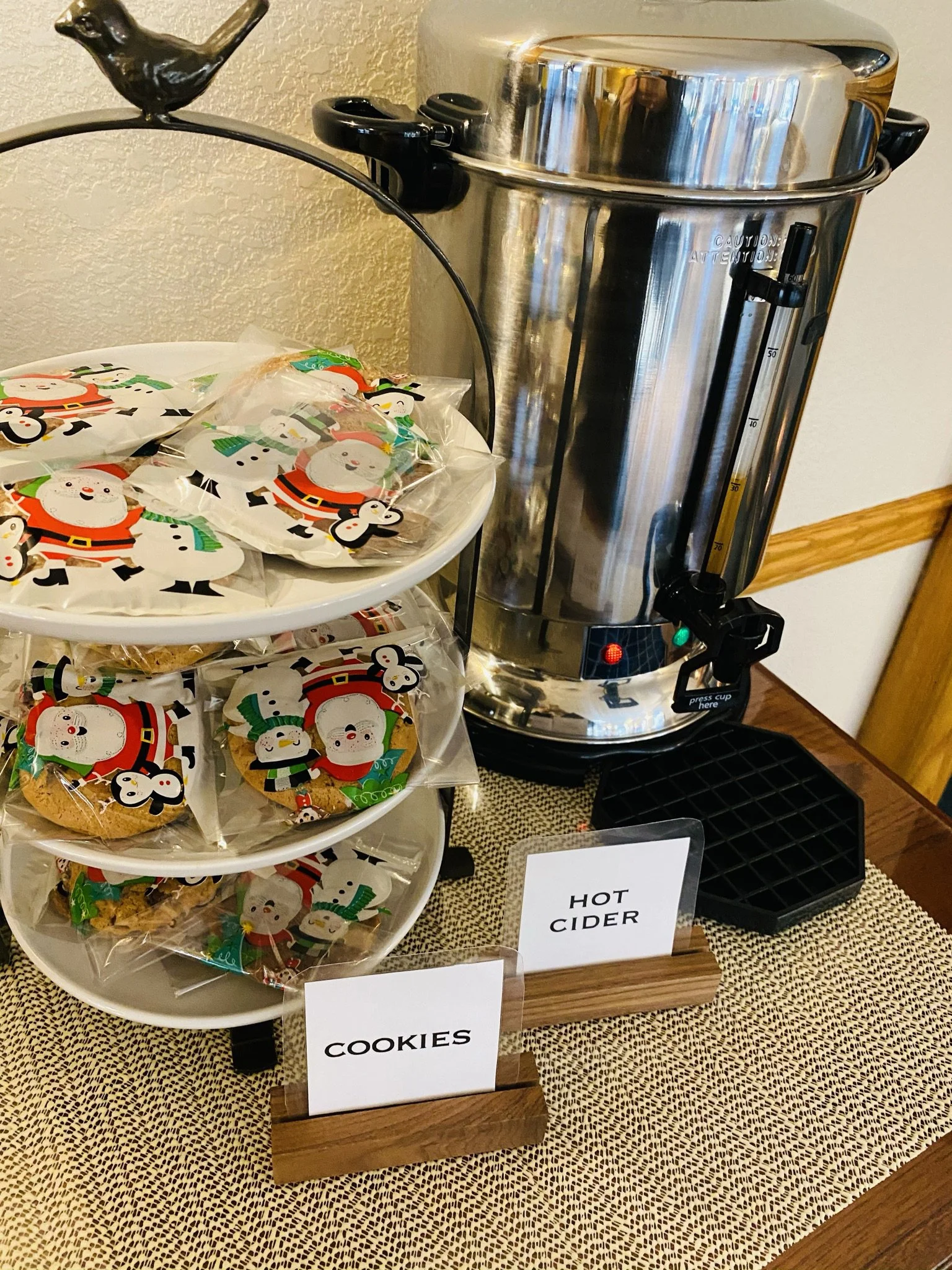 We offer Whidbey Coffee, tea, cider and cocoa in the lobby 24/7.